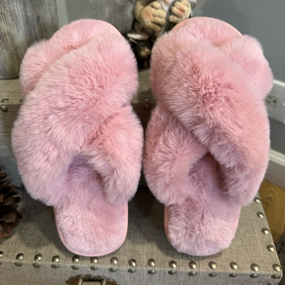 Step into comfort with these luxurious pink faux fur slippers. Perfect for lounging at home, these slippers offer both style and warmth.