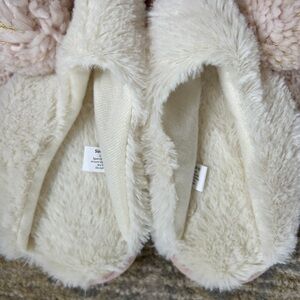 Soft and cozy slippers in pink and cream. Features playful pom poms for added charm.