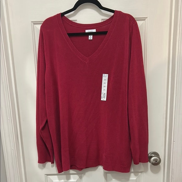 Stay warm and stylish with this cozy red V-neck sweater. Perfect for any occasion.