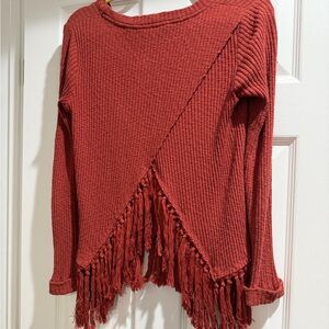 Stay warm and stylish with this cozy red sweater featuring a playful fringe hem. Perfect for any casual outing.