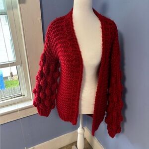 This vibrant red cardigan showcases a chunky knit texture, offering a relaxed fit and full-length sleeves. Its open front design makes it an ideal layering piece for added warmth and style.