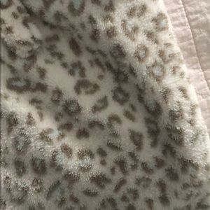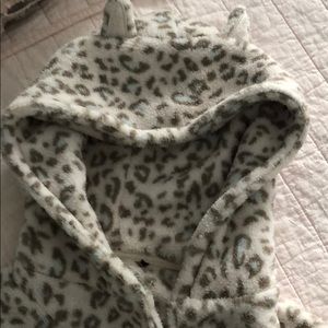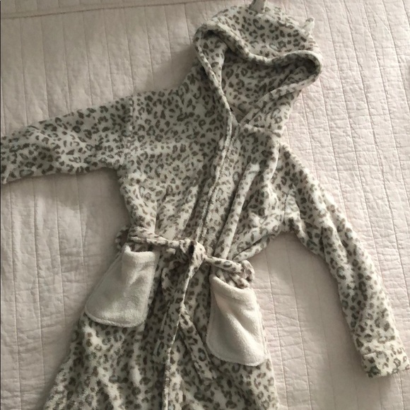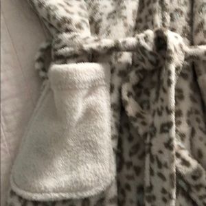 Soft and cozy leopard print robe in pinkish cream and tan with hints of baby blue in the spots. My daughter cut out the tag but sizing is a large which is about size 12-14.