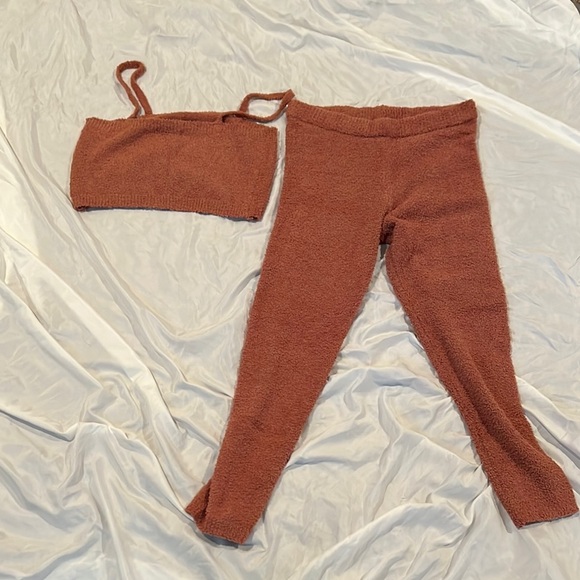 Soft knit set in a warm rust color. Includes a crop top and matching pants.