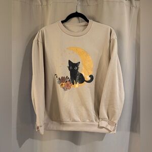 This sweatshirt features a striking black cat silhouette, elegantly poised with its tail curved upward. The feline is set against a captivating Halloween-themed backdrop, adding a touch of mystery and charm to your wardrobe.