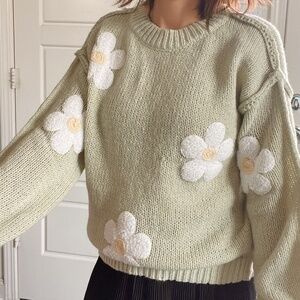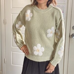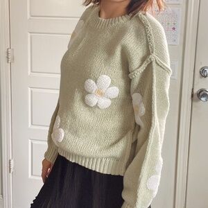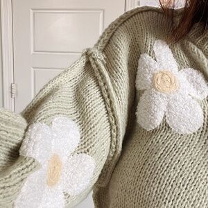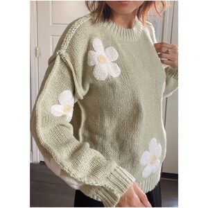 Cozy Sage Daisy Fuzzy Patch Reverse Stitch Sweater Top