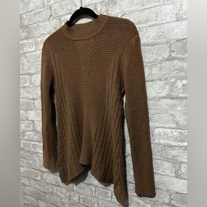 Gently worn - Cozy soft brown sweater - I could not find a material tag. I have dried this sweater on low and it remained the same size. I usually hang to dry this one, but worn maybe 3 times.