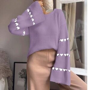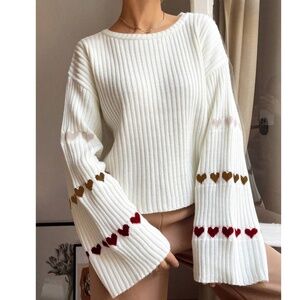Cozy Solid heart Print Bell Sleeve Loose Fit Sweater Top