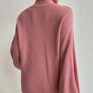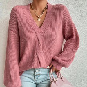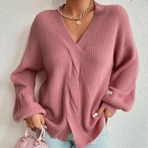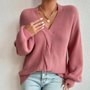 Cozy Split Hem weave detail vneck Sweater Fall Winter Pink