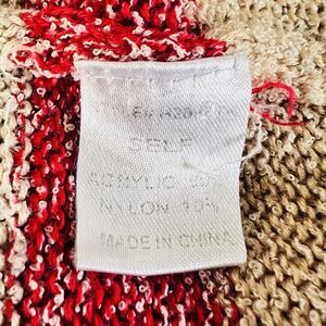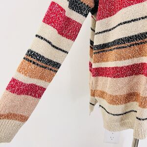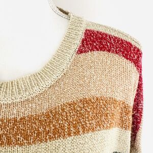 Embrace warmth and style with this cozy striped crew neck sweater. Featuring a blend of red, cream, and tan hues, it's a perfect addition to your casual wardrobe.