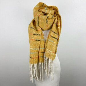 Cozy Super Soft Mustard Yellow Scarf. Fuzzy striped design, fringe detail