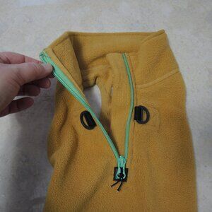 Keep your dog warm with this cozy tan fleece jacket. Perfect for chilly walks.