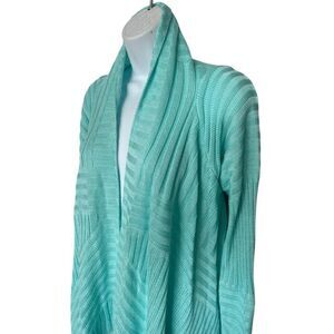 a light turquoise cardigan It has a ribbed texture and features an open front design with a draped, waterfall-style hem. The sleeves are long, and the overall style is casual and cozy, suitable for layering 🩵