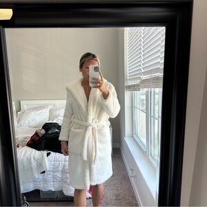 Soft and plush white fleece robe with a hood. Perfect for lounging. Pottery barn cream fur robe