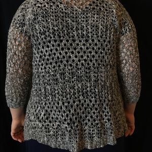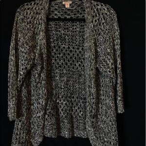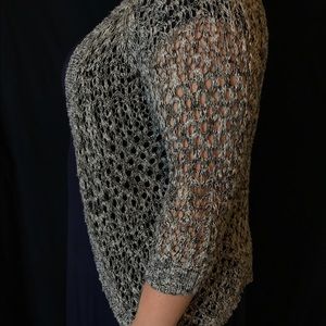 This cardigan is one of a kind! Loose knit, black and white threading. Very versatile!