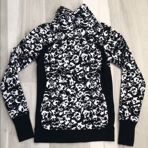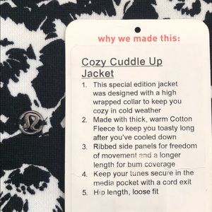 Brand new, with out tags. Washed it and found that it was too tight across my chest. Adorable jacket, off center neck zipper. Thumb holes. Pockets. Inner iPhone pocket. I’m so sad to let it go, but my boobs are just too big for it.
