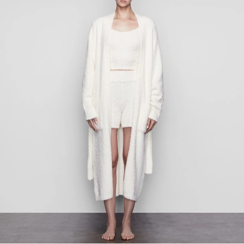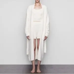 boucle knit side seam belt loop, boucle knit removable/adjustable belt, patch pockets, knit with stretch for comfort and ease, designed to wear two ways: styled closed with belt (robe) or styled open (duster) Alyona is size 4 and 5’10”, wearing a SKIMS S/M 76% polyester/24% nylon hand wash cold with like colors only. non-chlorine bleach when needed. do not tumble dry. imported
