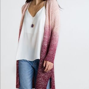 Feel cozy and soft in a beautiful ombré cardigan. Features chucks knit and side slits. Accessories are not included.