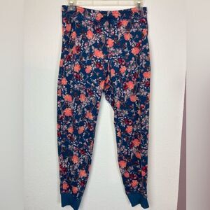 Pretty dark floral w/ burgundy and bright orange pops of color. Gorpcore, Cottagecore vibe floral sturdy weight floral joggers. Never seen this brand make these so had to have them! But a true to size L not my size. Great pockets. Classic joggers bottom. Elastic drawstring waist. Dark w/ pretty pops of bright. Sweatshirt material. EUC no flaws. Style many ways, multi season. Rare find. Waist is 16” rise is 12.5” and inseam is 30”. See closeups for best color depiction almost blue teal background. Best color pic is last one.
