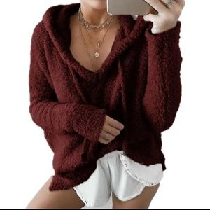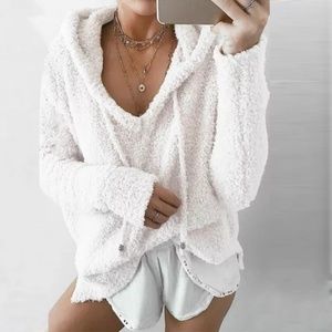 Super Soft and comfortable with pull tie hood and silvertone ends. Pull over style. Style out with denim, leggings boots, skirts. Please note, the actual items has shorter ties and not as low of a neckline.