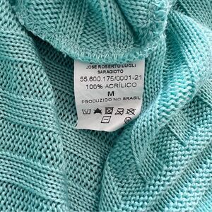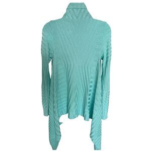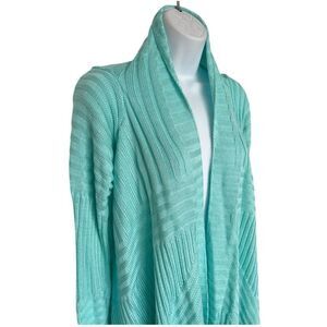 a light turquoise cardigan It has a ribbed texture and features an open front design with a draped, waterfall-style hem. The sleeves are long, and the overall style is casual and cozy, suitable for layering 🩵
