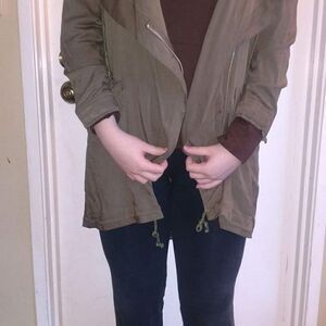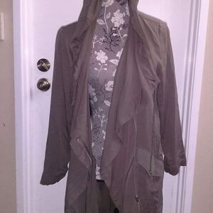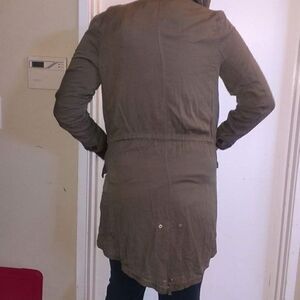 Army green utility jacket. Longer in back. Hooded. Soft, beautiful and in excellent condition. Casual elegance