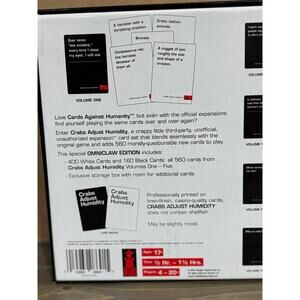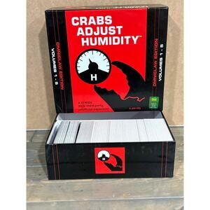 Includes all 560 cards (400 white, 160 black) from Crabs Adjust Humidity Volumes 1, 2, 3, 4 and 5, as well as an exclusive storage box with room for future expansion.