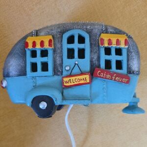 Charming camper night light with vibrant colors. Features a 'Welcome' and 'Cabin Fever' sign.