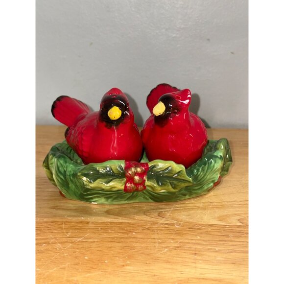 Cracker Barrel Ceramic Cardinal Birds Salt & Pepper Shakers With Holly Base