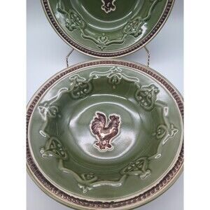 Cracker Barrel Elegant Rooster Green Set Of Two 9.5" Rimmed Bowls Embossed