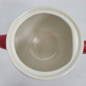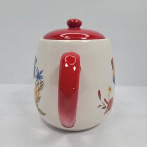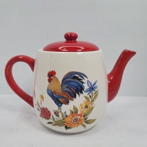A charming ceramic teapot featuring a vibrant rooster and floral motif, complemented by a red lid and handle. Holds up to 1.5 quarts.