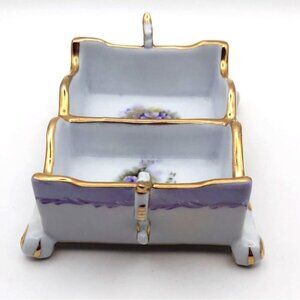 Elevate your tea time experience with this dual tea bag caddy. Its Victorian charm, floral design, and luxurious 10k gold trim make it a refined addition to your table.