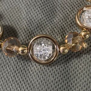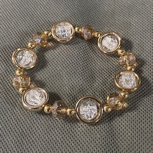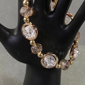 Crackled Glass Framed Beads Bracelet Clear Light Amber Gold Tone Stretch