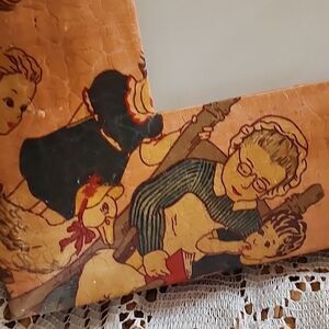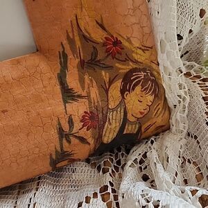This was created with fabric and crackling solution, to make a Crackled aged looking picture frame. There are a couple spots where crackle finish solution made some bumps. Backing is missing pull for the crushed velvet