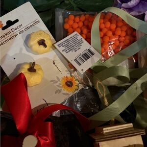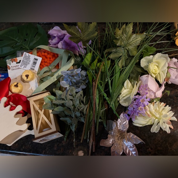 Assorted random crafting supplies with many fake flowers - pumpkins, puff balls, wooden pieces, flowers, and more! #diycrafts