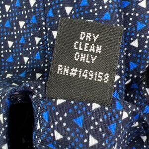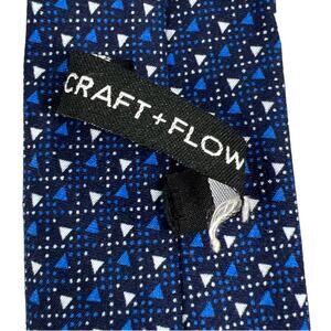 Boys geometric tie from Craft + Flow. Dark navy blue with white and lighter blue triangles. 100% Polyester-Dry Clean Only. Due to light & screen variations, colors may vary slightly from the images
