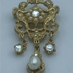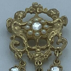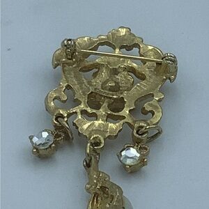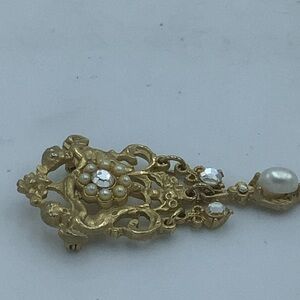 Beautiful Craft Gold Tone Scrolled Brooch with faux diamond and pearl center and dangling faux peals and diamonds.. Pre-owned, good condition.