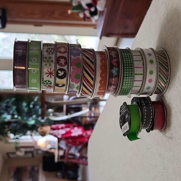 12 rolls of American Crafts Premium Ribbon + 3 rolls "ribbon trends" ribbon spools. Most are unopened. Non-smoking home.