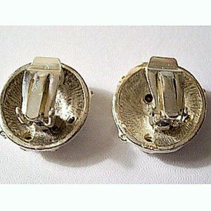Craft off white enamel nail head accents padded clip on earrings vintage silver tone plated textured metal finish assort shape clear square teardrop faceted embedded crystal stones. Visible 20 year vintage aging some tarnish, faded and aged metal finish spots one stone missing on the bottom of one earring. Sold as is. Craft unsigned vintage jewelry design. Measures 1 inch in diameter.