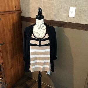 New without tags Craft & Barrow blouse with attached cardigan. Size large. Tan, black, and white colorway. Suitable for office, career, entertainment, or church. P1A249