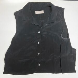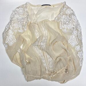 * cream crinkle 100% silk top with off-white crochet lace trim area of discoloration on back