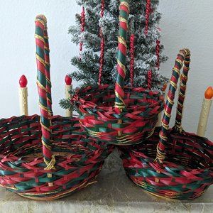 3 oval shape red, green, and gold graduating baskets with handles. Perfect for crafting, display. 12x9 with 10" handle, 10x7 with 9" handle, and 7x6 with 8" handle. Excellent condition.