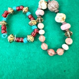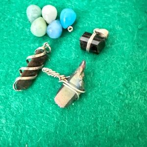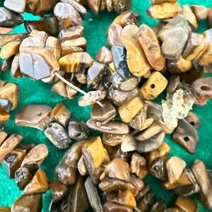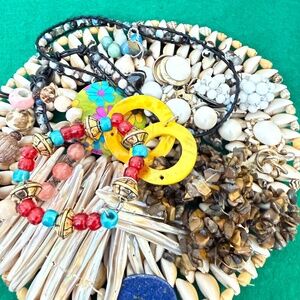 The strand of Tiger Eye chips is 30" and is coming apart. Beautiful shell mat probably made by indigenous people needs repair or you can use all of the shells in your art. Gorgeous champaign abalone bracelet needs restringing. Vintage earrings, stretch bracelets, a wraparound needs repair. Great crafter lot.