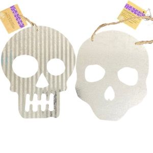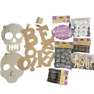 Large lot of 10 Halloween decorations. In new condition. Skeletons, mini glassware, witches signs, paintable signs