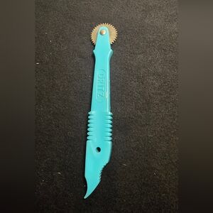 Cutting Tools: The tool with the blue handle is a tracing wheel (or rotary cutter), used for marking fabric or cutting through layers.