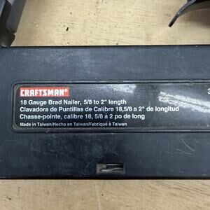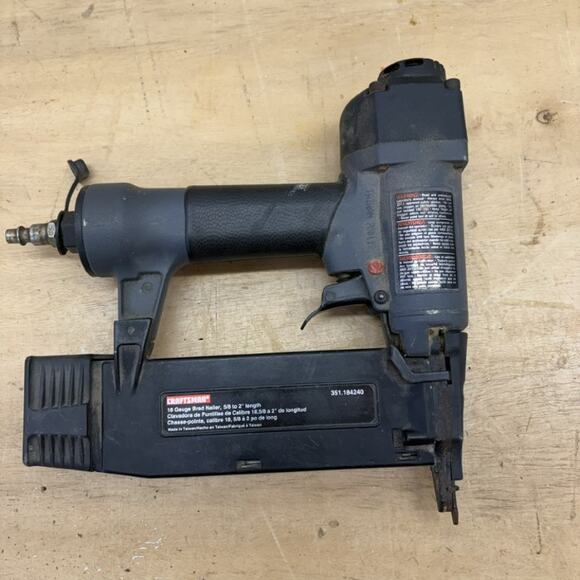 For sale is a used CRAFTSMAN 18 Gauge Brad Nailer, Model 351.184240. This air-powered tool is designed for 5/8" to 2" length nails. It is a genuine Craftsman product, made in Taiwan. As visible in the photos, the tool shows clear signs of use, including surface dirt, wear, and some rust/discoloration on the metal components, particularly the magazine and coupler. It requires an air compressor for operation. Please review all photos for an accurate assessment of the condition before purchase as the unit has not been tested. and is being sold as is.