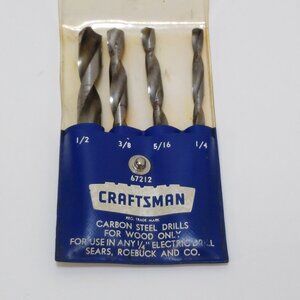 This vintage set of Craftsman carbon steel drill bits includes four sizes: 1/2", 3/8", 5/16", and 1/4". Designed specifically for wood, these durable bits are ideal for use in any 1/4" electric drill. A perfect addition to any craftsman's toolkit, these bits come in their original Sears packaging.
