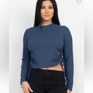Casual look that’s easy to pair and wear. Stretchy lightweight material with ruching on both sides so you are able to make it as short or long as you want. Also comes in a navy color as shown above.