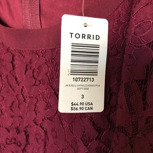 Cranberry colored top Lace on top, flows chiffon at bottom Never worn; new with tags