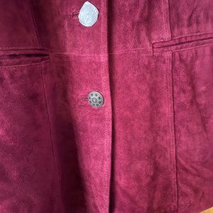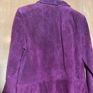 The color is a true deep cranberry, not purple. This is new and the metal buttons are still covered with tissue. There is tissue around the collar so you can see the 'cut.' Pleat in the back of the coat and extra buttons included. Hip pockets and fully lined. Beautiful traditional jacket.