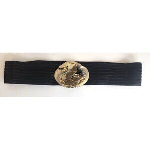 This Charmant Belts Beverly Hills Stretch Belt is a vintage 1980s piece featuring enameled Crane Birds on Gold buckle with a black stretch belt. The buckle measures 3.5 x 2.75 and the belt is 27-36" long x 2.25".